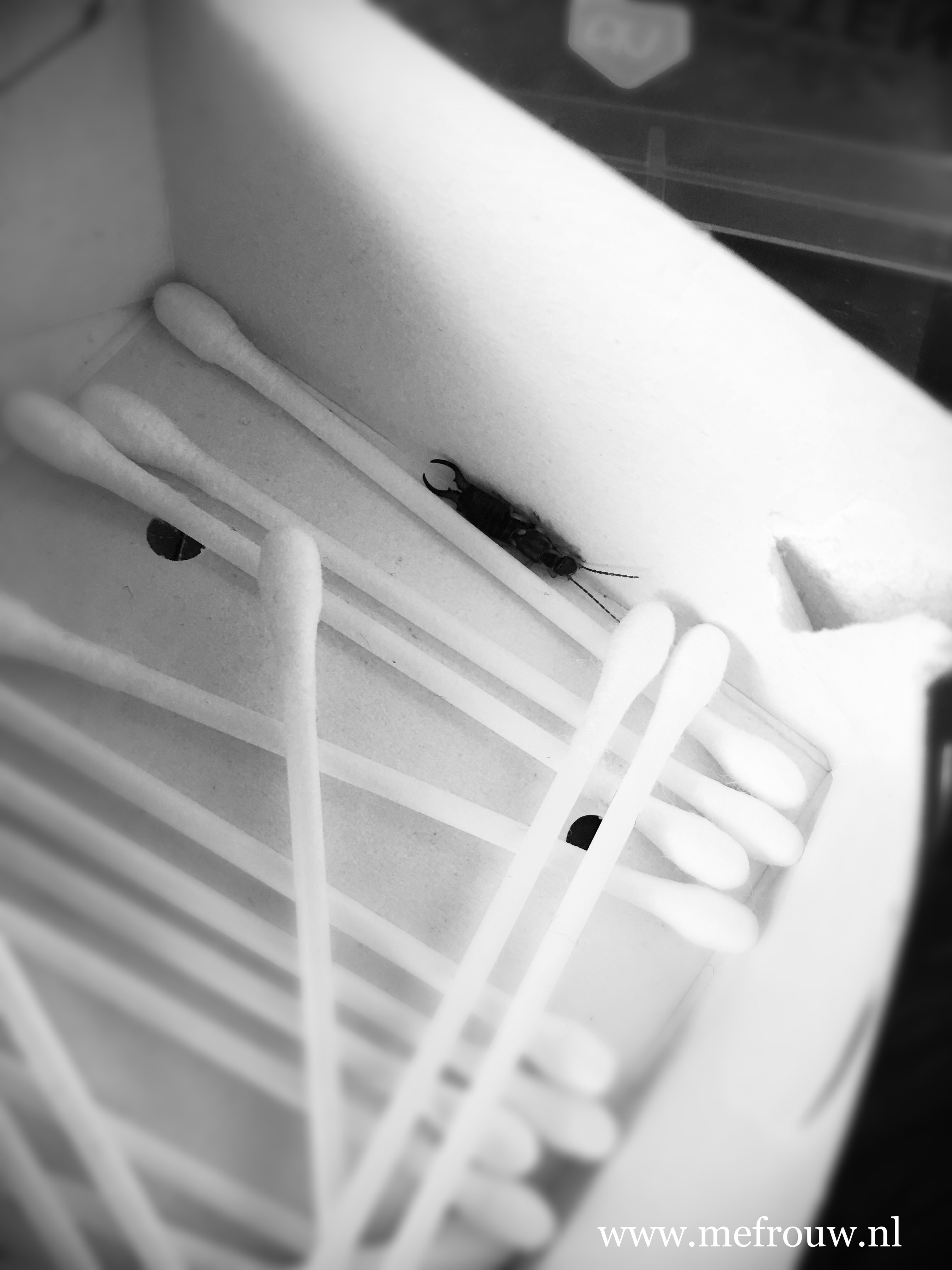 Als ik begin met de koffer uit te pakken en de spulletjes weer op hun plek terug zet, zie ik in het doosje van de wattenstaafjes een verstekeling zitten. Broodje aap of niet deze oorworm maakte mij erg aan het lachen.