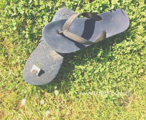 Je kent het wel, als het nopje van je lievelings slipper door de zool heen scheurt. Flink balen! Net nu we ergens in de middle of nowhere op een boerencamping staan en het zonnetje volop schijnt. Als we ’s avonds aan het Veerse meer wat verkoeling zoeken op een strandje valt mijn oog op een plastic clipje van een broodzak. Single waste plastic en bovendien zwerf afval, maar in dit geval perfect om de slipper van Finn te restaureren.