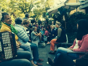 Wie kon er een mooi verhaal voorlezen? Ik dacht meteen aan een oude juf van Qyra die kan zo prachtig vertellen. Zij woont toevallig ook in ons dorp en ze wilde het graag doen! Bij feest hoort natuurlijk ook muziek en de buurman, de dominee, anex straatmuzikant wilde ook weer graag begeleiden op de accordeon.